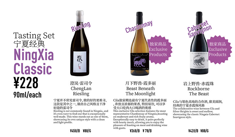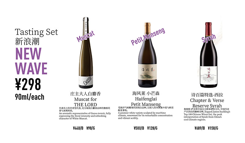 The Ningxia set features classic selections representing the region, while New Wave is a combination of boutique or new-wave wines from three different regions. Each set includes three wines, 90ml each.