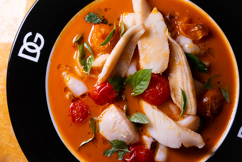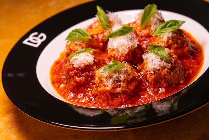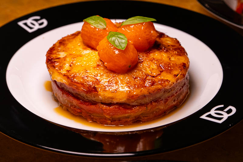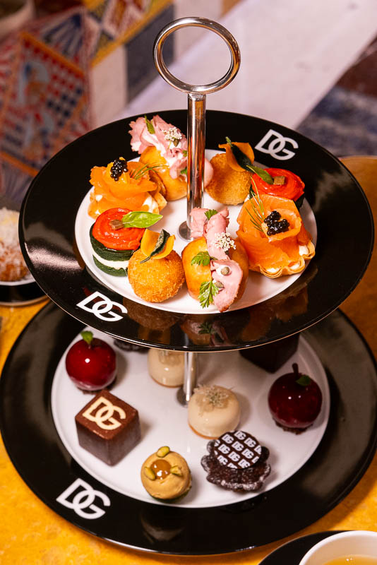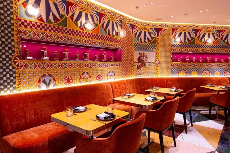 The interiors here are loud and totally on brand for Dolce&Gabbana, dazzling the senses with bold, ostentatious colors and their signature Carretto Siciliano motif. It’s rebellious, to say the least, and makes for quite the setting for a “casual” meal.