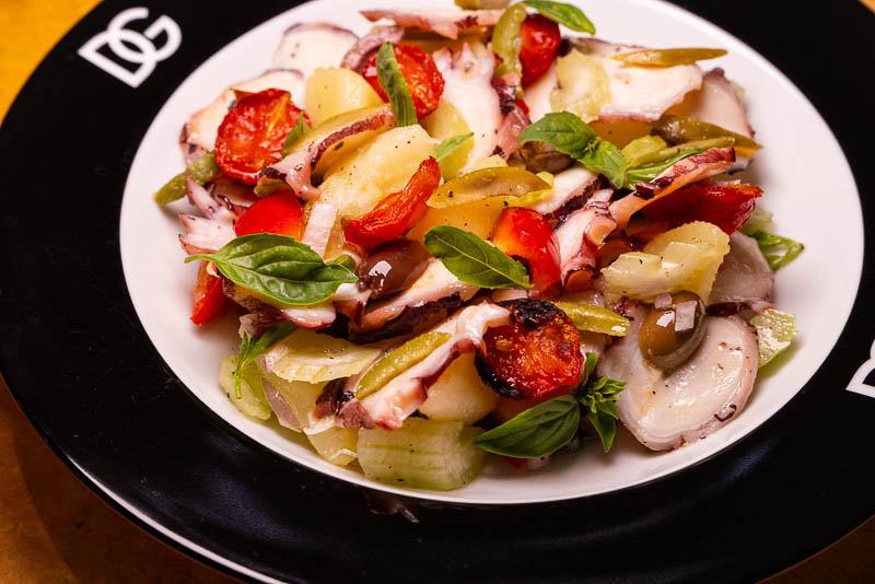 For something lighter, the Polipo e Patate (¥128) offers a warm salad of thinly sliced tender octopus leg with baked potatoes, celery, three different kinds of olives, mini capers, and lemon dressing. It underscores the octopus’ freshness while playing up the salinity of olives and capers.