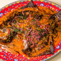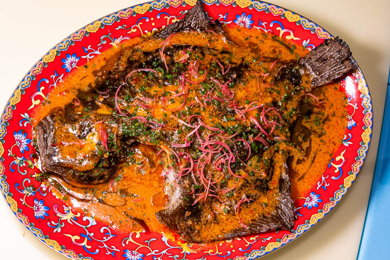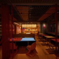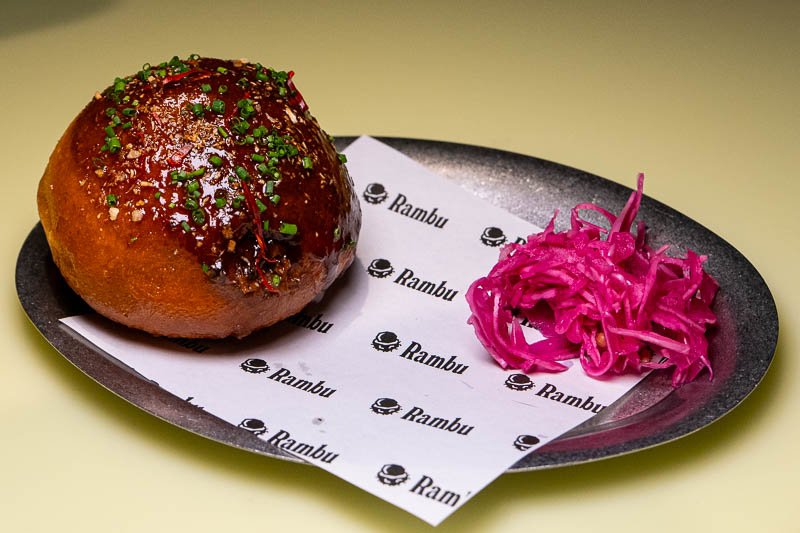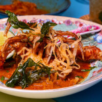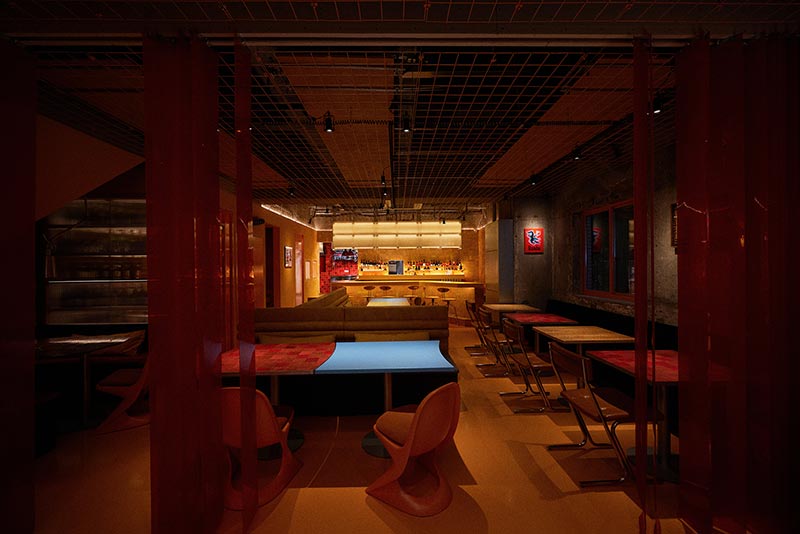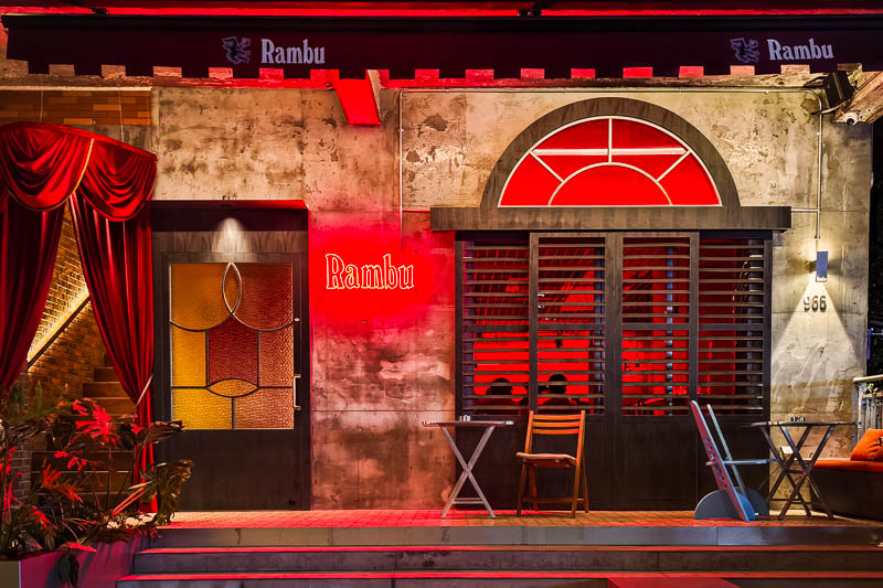 Rambu is creative Southeast Asian restaurant on Wuding Lu in Jing’an, Shanghai, offering a contemporary take on the region’s cuisines. Marked by a glowing neon-red facade, the space feels cozy and intimate yet distinctly communal, with baby blue and pandan green tables and a bright yellow wavy bar facing the kitchen, accommodating up to 46 guests. In the kitchen is Singaporean chef Jun Nishiyama, whose cooking has earned a devoted following, and the pedigree shows.