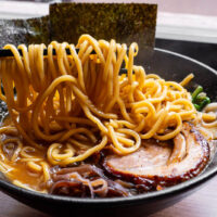 Ramen Shichiton (七豚) is ideal if your main objective is to fill up on noodles. I can’t say this with scientific certainty, but the portions here are absolutely massive. Their house special noodles are extra-thick egg noodles, which soak up broth like crazy. They also have medium or thin noodles. There are two locations, operating just a block apart. Because the shops themselves are tiny, soups are made fresh daily at a central kitchen. The signatures are a Jiro-style ramen built on a rich tonkotsu base, topped with cabbage, bean sprouts, raw garlic, and chashu, and the Yokohama Tonkotsu, featuring wood ear mushrooms and wilted pea shoots. First round of additional noodles are on the house.