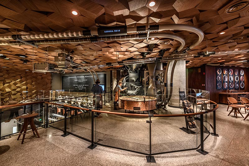 At its center stands an impressive two-story 40-ton copper cask, adorned with more than 1,000 traditional Chinese stamps, hand-engraved to narrate the story of Starbucks and its Reserve coffee. True to its name, roasting also happens here. Green beans roasted on-site travel through swooping copper “symphony” pipes, whizzing through the air to cool before filing directly into silos at the coffee bars.