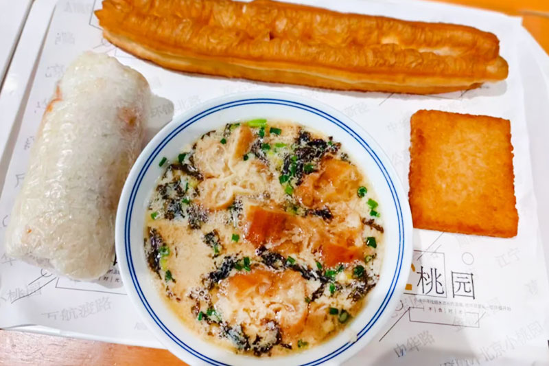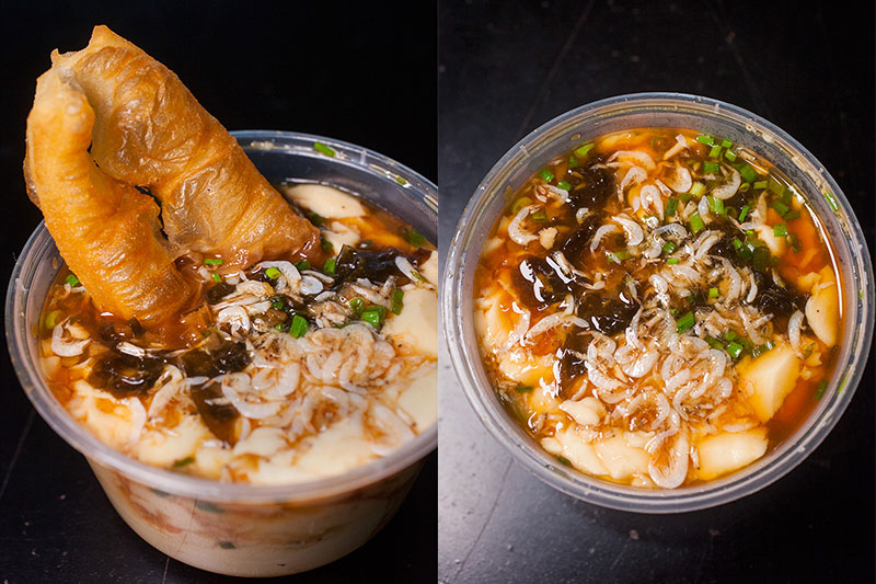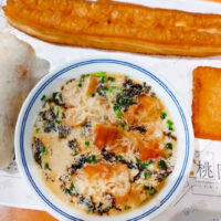 Taoyuan Village is a Taiwanese chain that’s been serving traditional breakfast dishes since 2013. The one to get is the tofu pudding (doufuhua, 豆腐花), which is usually enjoyed as a savory dish with condiments of light soy sauce, dried shrimp, and kelp. The best combination with tofu pudding is a crispy fried cruller (youtiao, 油条), a hearty addition that soaks up flavor. Other items include soy milk (豆浆), drank on its own or similar to the tofu pudding, flaky baked pastries (shaobing, 烧饼), sticky rice rolls (fantuan, 饭团), steamed buns (baozi, 包子), xiaolongbao, dumplings, and more.