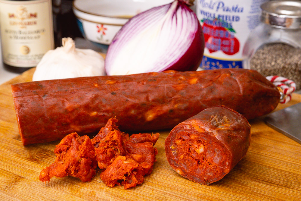 Sobrassada is a raw, cured sausage from the Balearic Islands in Spain. It’s a soft, paprika-spiked sausage similar to the Italian Nduja. It’s traditionally spread on bread or added to stews and pasta. To coax out the flavor and oils, the best way is to pan-fry it.
