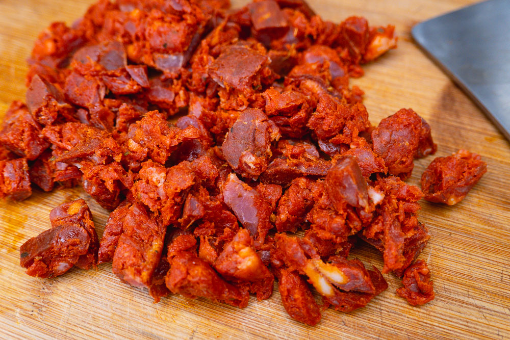 2. You’ll only need a third of the whole sobrassada—about 350-400g. Remove meat from casing and chop the meat up. Try to break it up as much as possible.