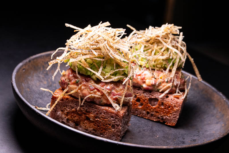 Next, the Steak Tartare (¥88/two) is seasoned with house pickles for added complexity, then topped with avocado and taro chips on buttered, toasted black wheat bread.