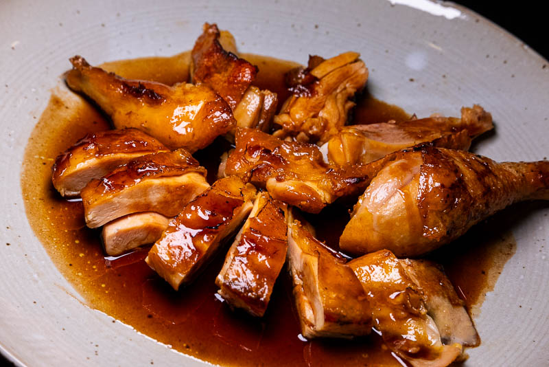 A must-order is the Alchemy Roast Chicken (¥158), cooked in the firewood oven, carrying a gentle smokiness. The texture is phenomenal, taut yet tender — a hallmark of Qingyuan chicken — and juicy with a crisp skin. But its the jus that brings it together, reduced slowly into a velvety, concentrated sauce.