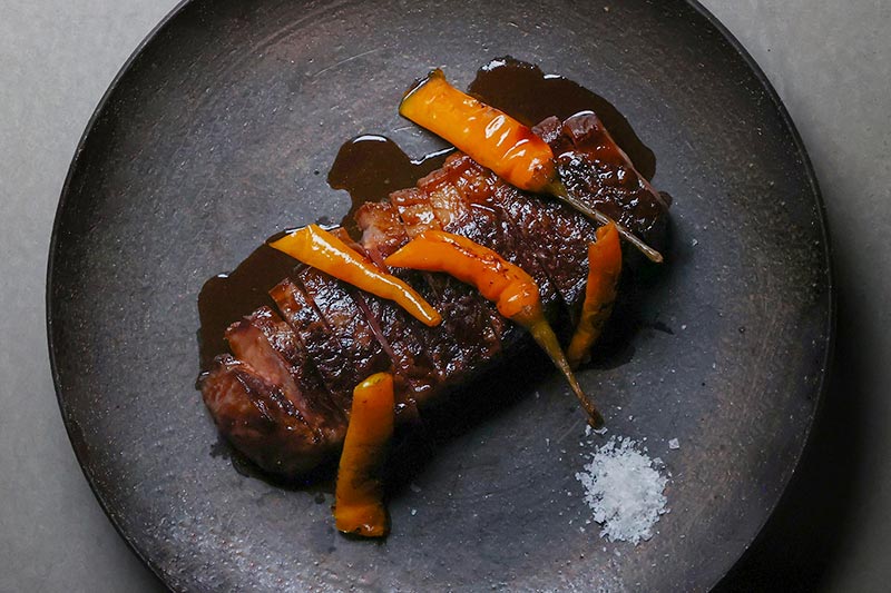 The Australian Wagyu MB5+ version comes with mushrooms and chives, leaning deeper and more meat-forward. A side of seasoned kombucha adds an extra hit of umami.